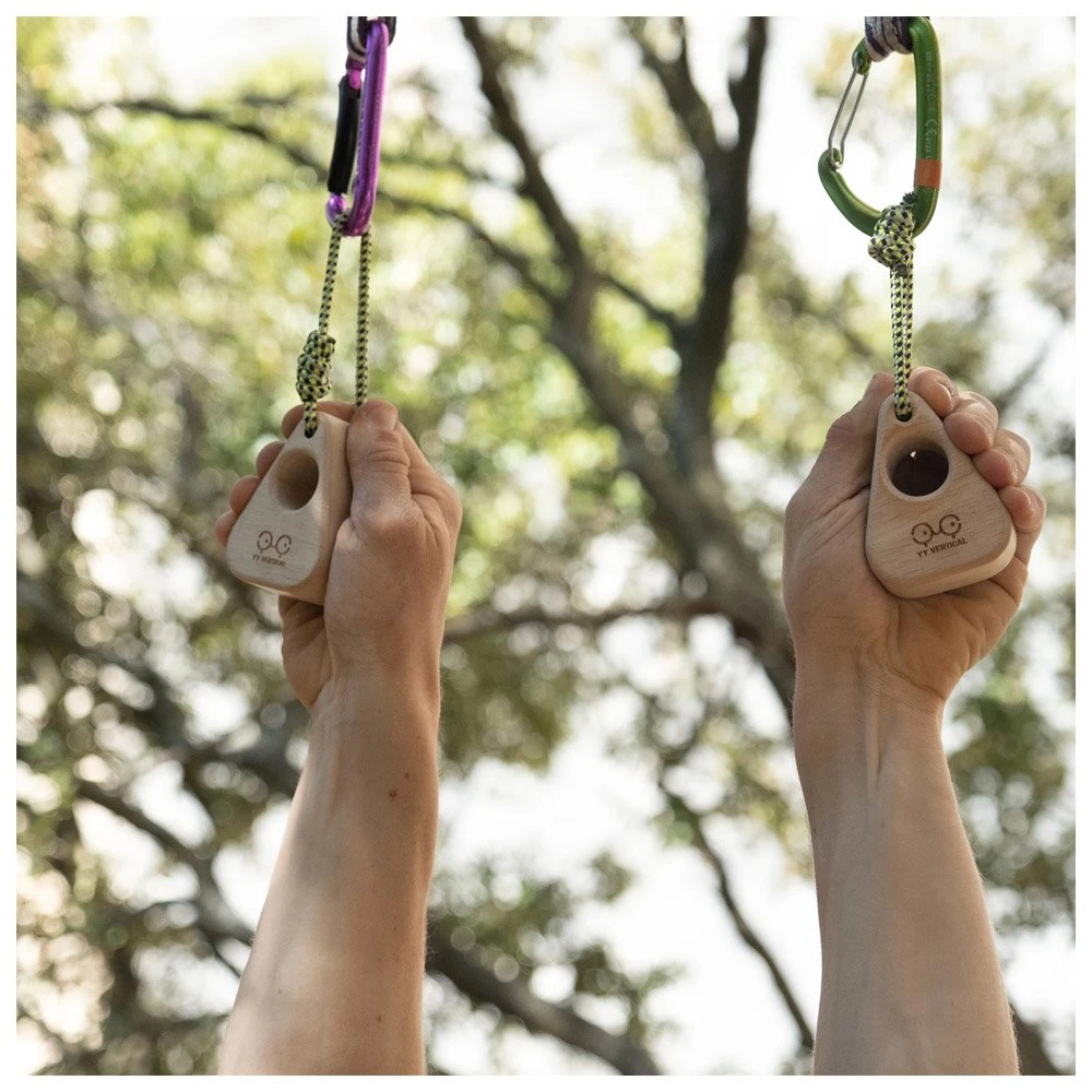 El YY Vertical Duo es una pequeña ayuda para escalar fabricada con madera reciclada para aislar el desarrollo muscular y tendinoso de uno o dos dedos. Tiene un dedo y dos dedos de sujeción de 25 mm de profundidad y puede utilizarse cargado ligeramente con un bungee o peso o suspendido como un peso corporal.