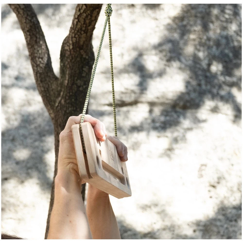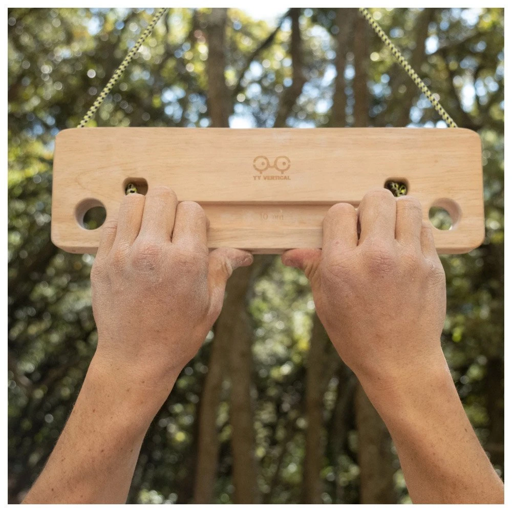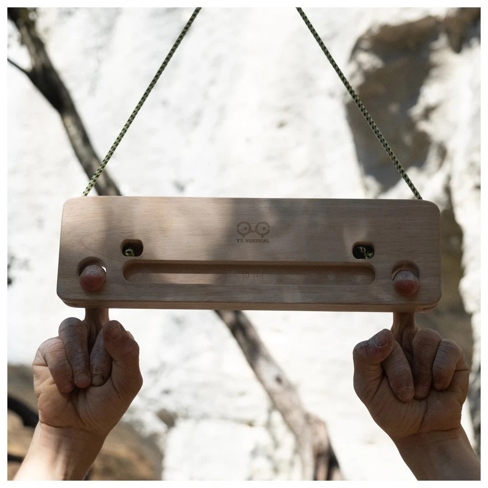 El YY Vertical Travelboard es una pequeña viga de entrenamiento de madera para escalar, con un tacto suave y un buen agarre. Tiene dos modos de inclinación, tres deslizadores de 25, 15 y 10 mm, y dos piezas de un solo dedo para aislar el desarrollo muscular de los dedos. Permite trabajar en suspensión o tracción y fortalecer las estructuras pasivas y activas de los dedos, los brazos y la espalda.