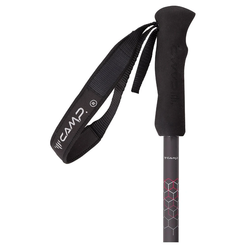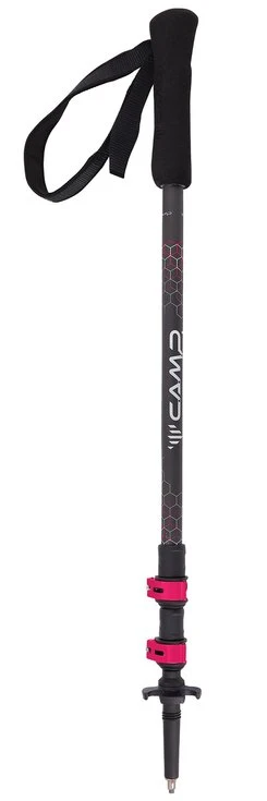 El Camp Backcountry Carbon W es un bastón verdaderamente ultraligero gracias a su construcción en fibra de carbono con tres pequeños segmentos. Los segmentos inferiores están graduados para facilitar el ajuste, que es muy rápido con los clips de aluminio. Las asas de espuma son muy ergonómicas y cómodas, al igual que las correas, que además están diferenciadas izquierda/derecha.