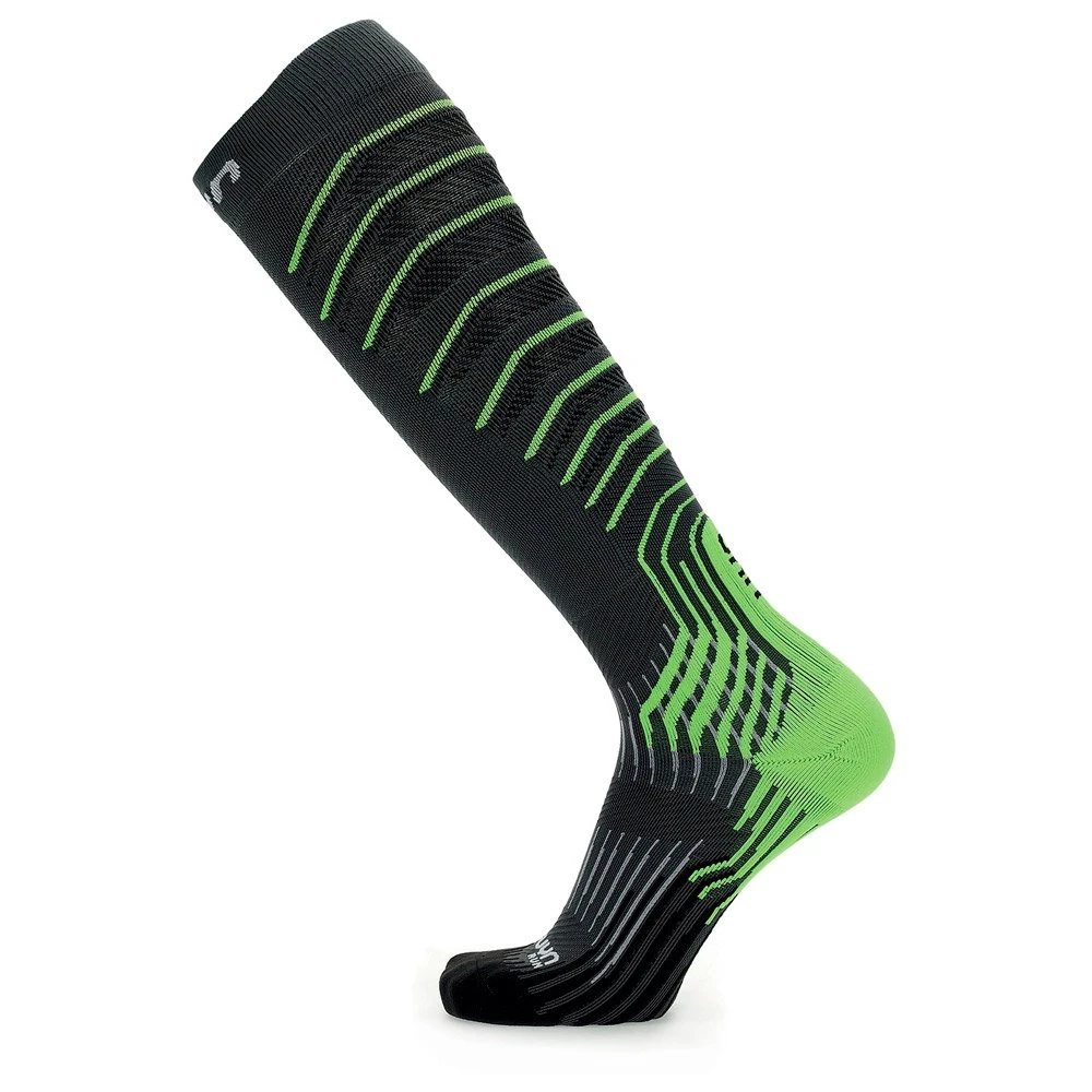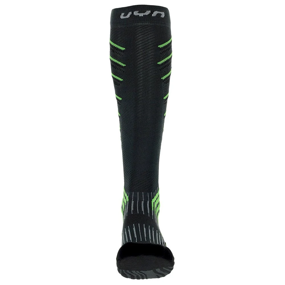 La característica especial de estos calcetines de compresión para mujer UYN es su diseño sin costuras, hecho de una sola pieza de tejido compuesta por 84% de poliamida, 9% de elastano y 7% de polipropileno. Desarrollados para el trail running, proporcionan compresión en zonas clave de los pies y las piernas para garantizar que los músculos tengan un suministro adecuado de oxígeno durante la carrera. Los refuerzos en los tobillos y los tendones de Aquiles ayudan a contener la presión para que no haya molestias. La construcción 3D Cool Air Flow favorece la transpiración para mantener los pies secos y frescos. El corte ligeramente más alto en la parte trasera proporciona una mejor envoltura de la pantorrilla y apoyo.