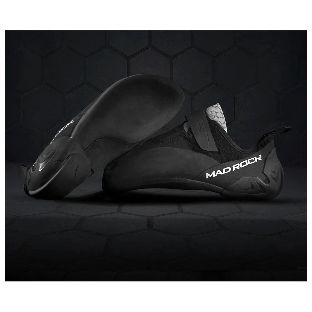 El pie de gato Drone HV de Mad Rock es un modelo para pies anchos que combina rendimiento y confort. Este modelo híbrido entre bailarina y cierre de velcro ofrece los beneficios de ambas construcciones abrazando perfectamente la forma de tu pie y eliminando los puntos de presión. Lo mismo ocurre en la zona del talón que, gracias al diseño Expandable Edge Heel, se adapta perfectamente a la gran mayoría de formas de talón para ofrecer un excelente ajuste. La amplia sección de goma en la puntera del contrafuerte proporciona una excelente eficacia en las pendientes. Este zapato tiene una forma agresiva, lo que lo hace especialmente adecuado para la escalada deportiva técnica o el búlder. Sin embargo, sigue siendo muy cómodo para que puedas disfrutar de largas jornadas de escalada.